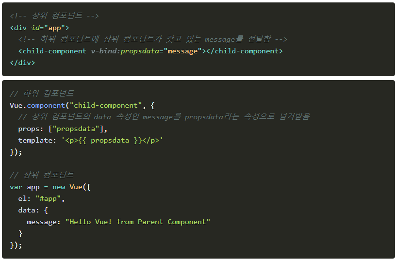 - 부모 -> 자식 : 데이터(props)를 내린다.