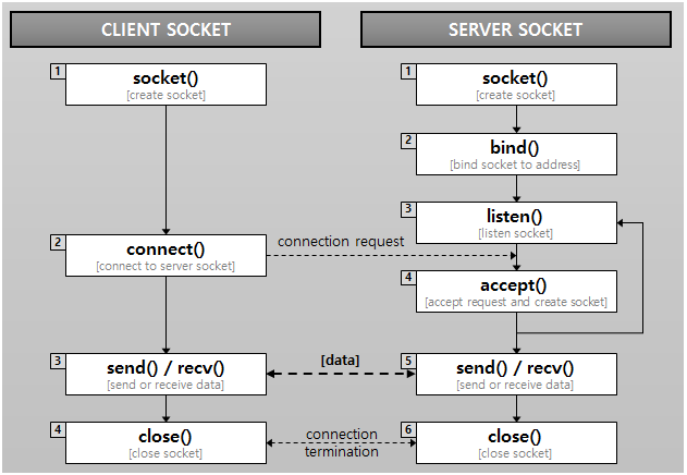 4) 이를 통해 클라이언트와 서버는 서로 send(), recv()하며 데이터를 송수신한다.